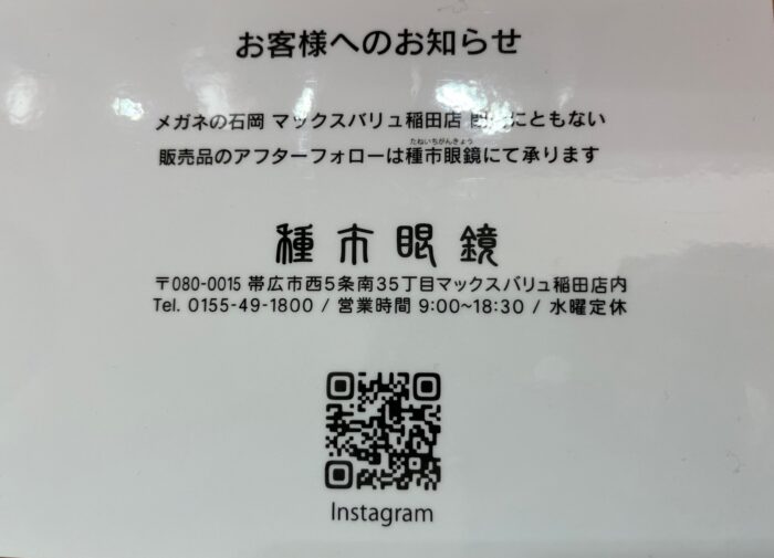 2025.11.08 メガネの石岡での販売品のアフターは当店で。 2023年3月に閉店しました、「メガネの石岡マックスバリュ稲田店」での販売品のアフターフォローは 種市眼鏡にて承りますのでお気軽に調整や修理、クリーニング等お立ち寄りください。