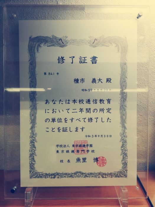 勤めながら東京眼鏡専門学校に通信教育で2年間勉強し卒業しております。