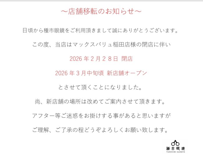 2025.11.13 店舗移転のお知らせ 帯広市にあるメガネ店、種市眼鏡です。 移転のお知らせです。 店頭では以前からお伝えしておりますがこちらでも念の為。 色々とご迷惑おかけしますが宜しくお願いします。 本日もご来店お待ちしております。